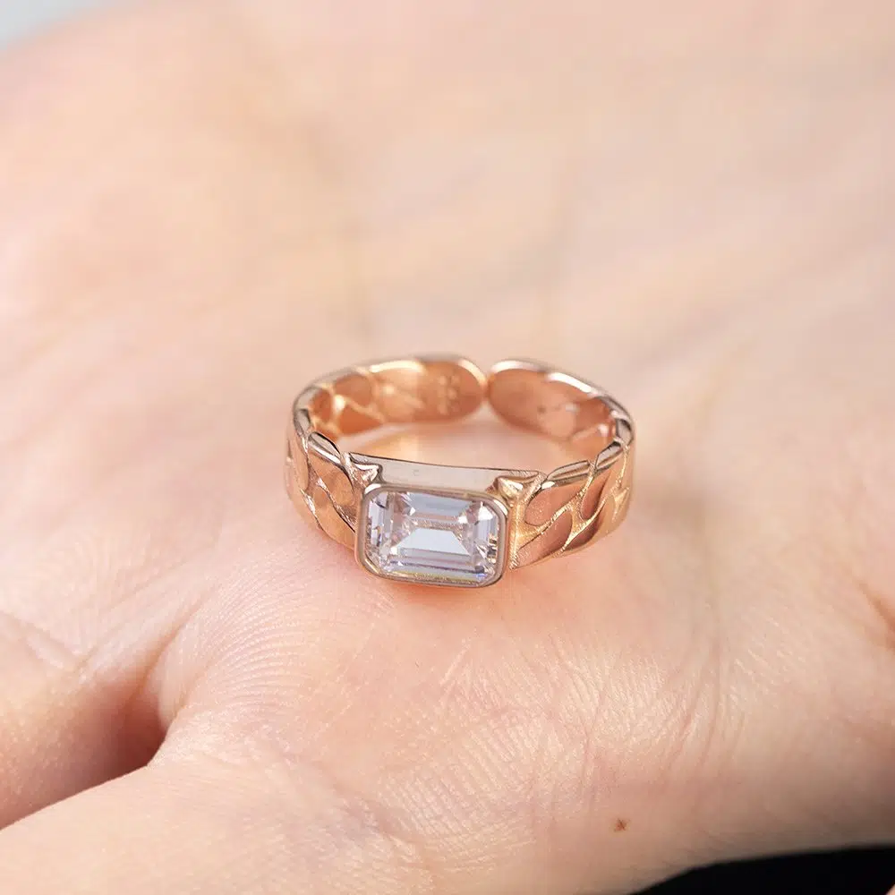 | Etiketler | Beyaz Zirkon Taşlı Zincir Tasarım Rose Renk Ayarlanabilir Ölçü 925 Ayar Gümüş Kadın Tektaş Yüzük |