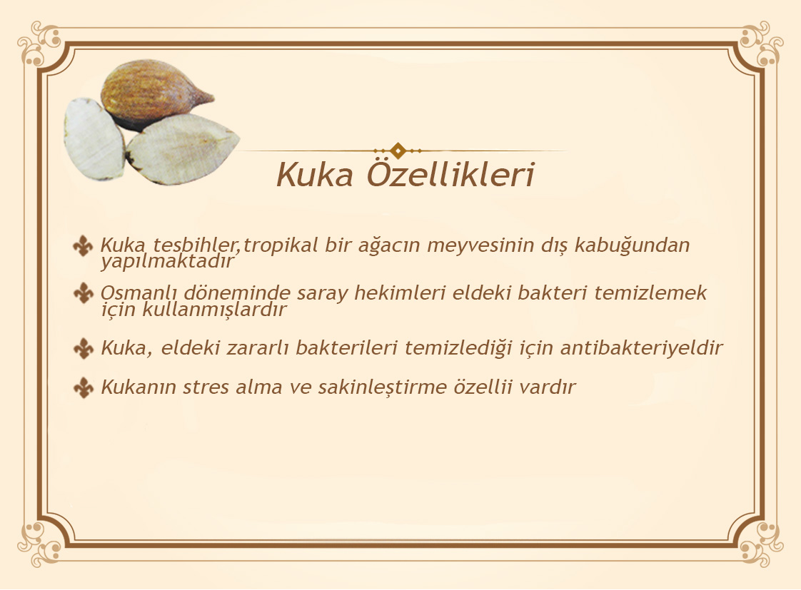 Kuka, tropikal bir ağacın meyvesidir. Hindistan cevizine benzeyen bu meyve, sert bir yapıya sahiptir. Osmanlı döneminde genellikle sağlık sektöründe kullanılırdı. Bunun sebebi de kuka ağaçlarının antibakteriyel özelliklerinin olmasıdır. Öyle ki, kuka tesbih taşımayan hekimler saraylara bile alınmaz, halk da onlara tedavi olmayı tercih etmezmiş. Kullanıldıkça kararan ve değeri artan kuka tesbihler de yaygın olarak kullanılmaktadır.
